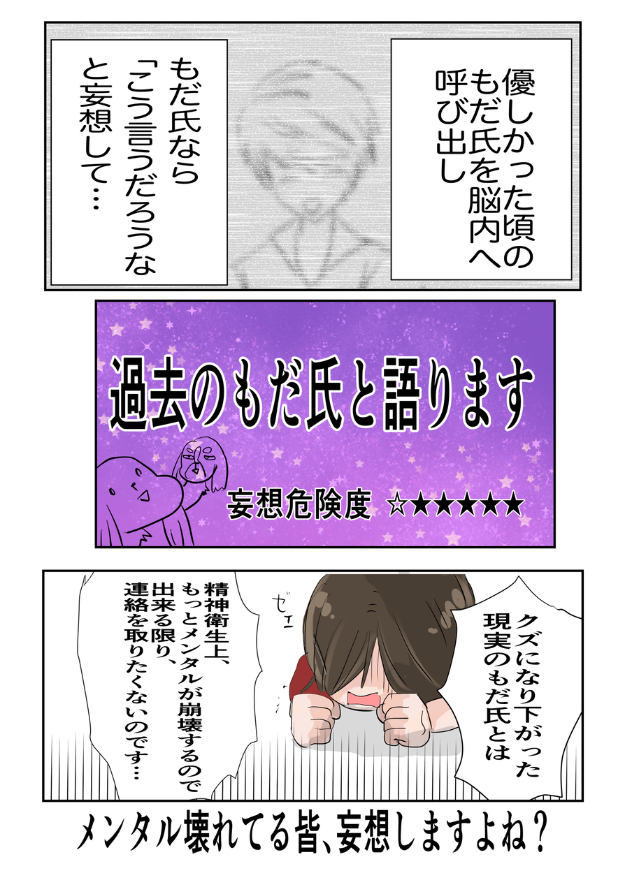 今は誰かに相談しても 良き配偶者だった頃の、もだ氏以上の心の寄り添いを求めることは不可能で、「もう私にはそういう相手がいないのだ」…と、また絶望の淵に陥るのです。