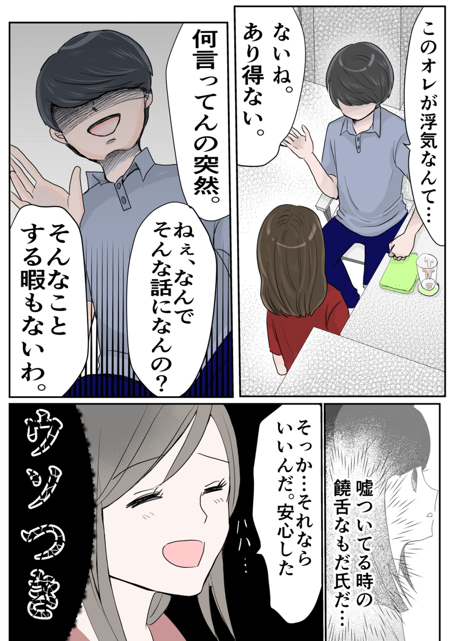 「浮気してるんじゃないか」と思わず口走ったざくろに、動揺しながら「浮気してないよ」というもだ氏。